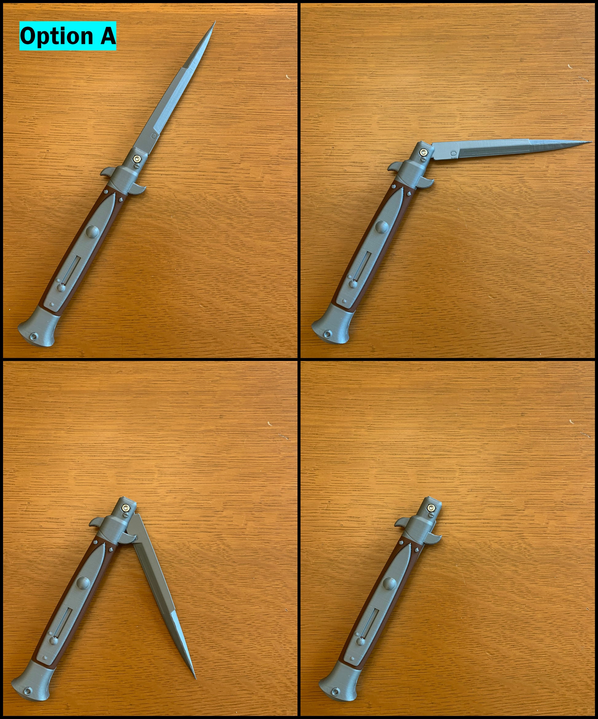 On the folding blade options, the tightness of the blade can be adjusted by turning the M3 bolt. Tightening it will hold the blade in place if you want it to stay in a certain position. Loosening it will make it easier to flick out. You may need to play with the tightness of that bolt to make it suited to your liking. All options are 3D printed on a Bambu X1 Carbon Combo. It has material switching ability which allows it to print in multiple different colors. Therefore, no paint is used on the colored options. The knife is also completely harmless and safe since it is made from plastic. It has no sharp edges and is intended for cosplaying or displaying.