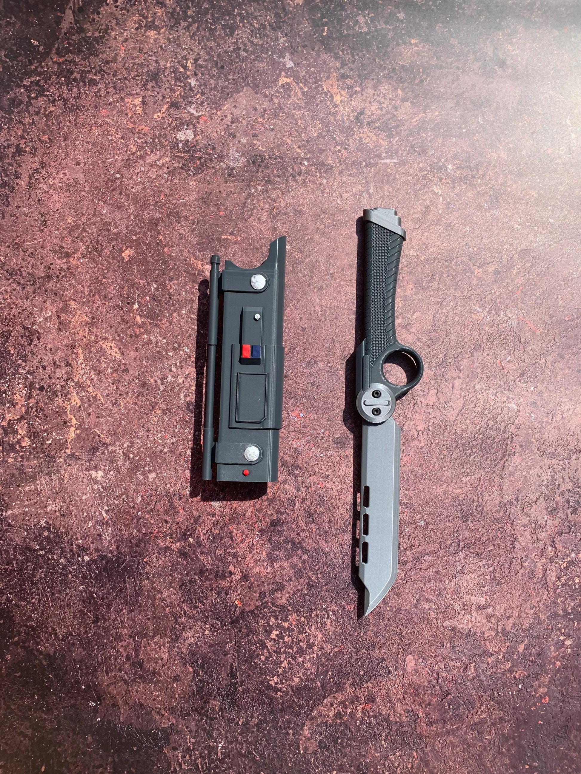 A 3D printed Vibroblade with sheath! You can buy just the knife, or the knife and its sheath. The sheath comes with a clip so it can be attached to a belt.
